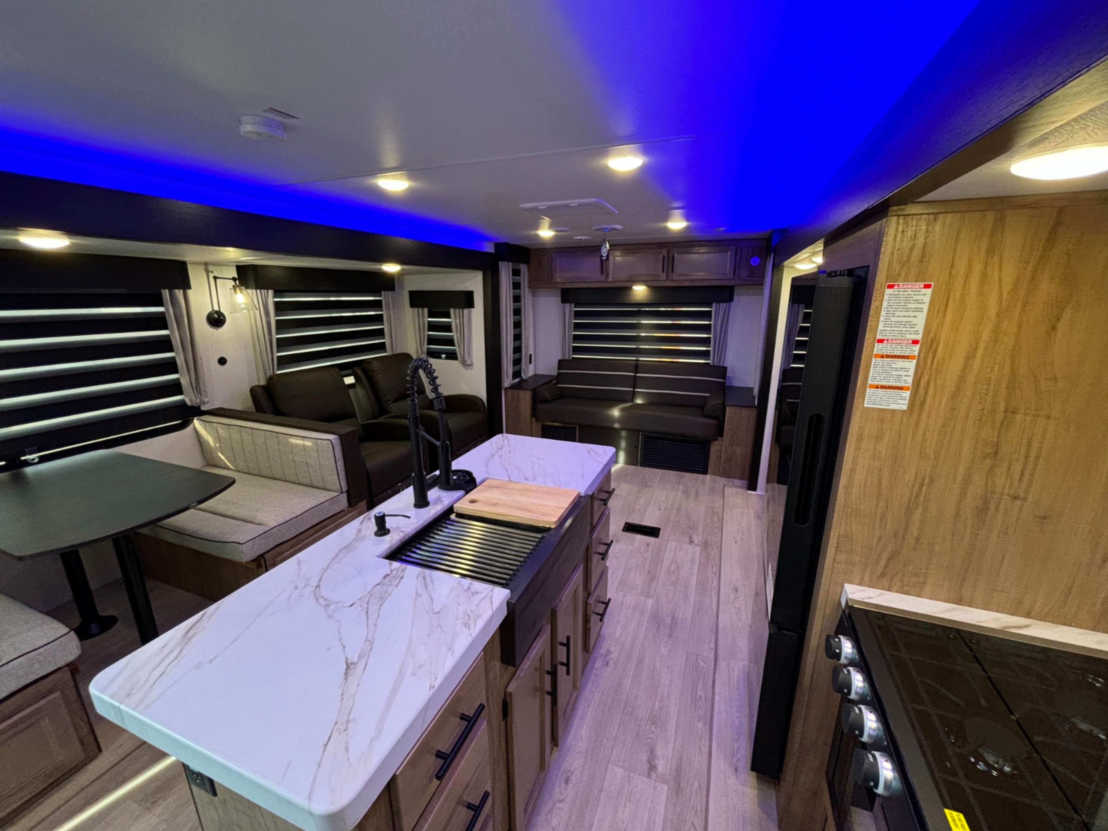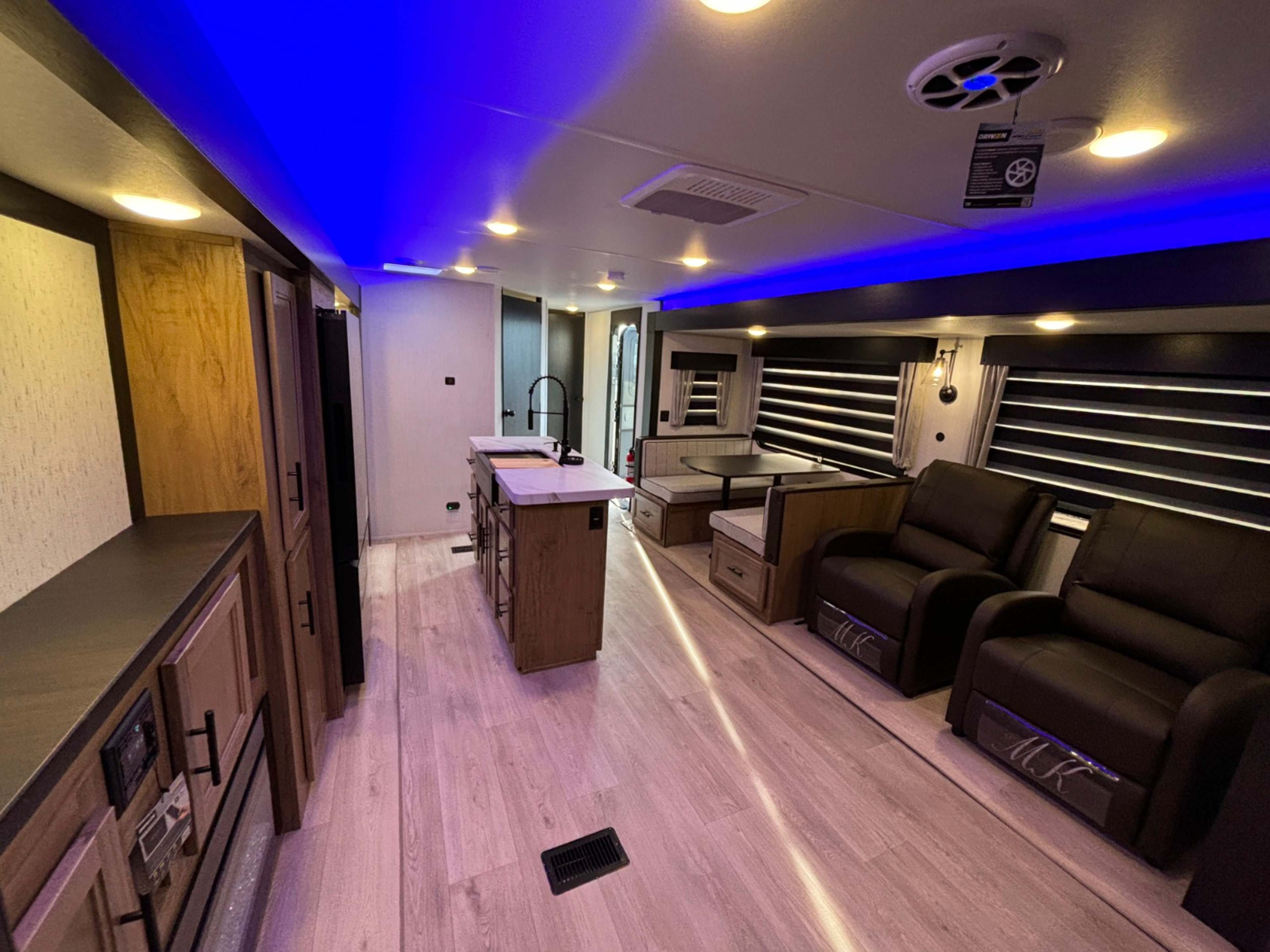 With two large slides opposing each other, you will have plenty of interior space in this travel trailer! The rear living area has a sofa with end tables to set your drink on and two recliner chairs across from the fireplace with a TV mount above it. Meal prepping will be easier with the kitchen island and you can enjoy your meals at the booth dinette then play a card game or two. The front private bedroom has a walk around queen bed to lay your head on at night with wardrobes on either side to hang your clothes and an entrance into the dual entry bathroom which has a neo-angled shower to freshen up in each morning!